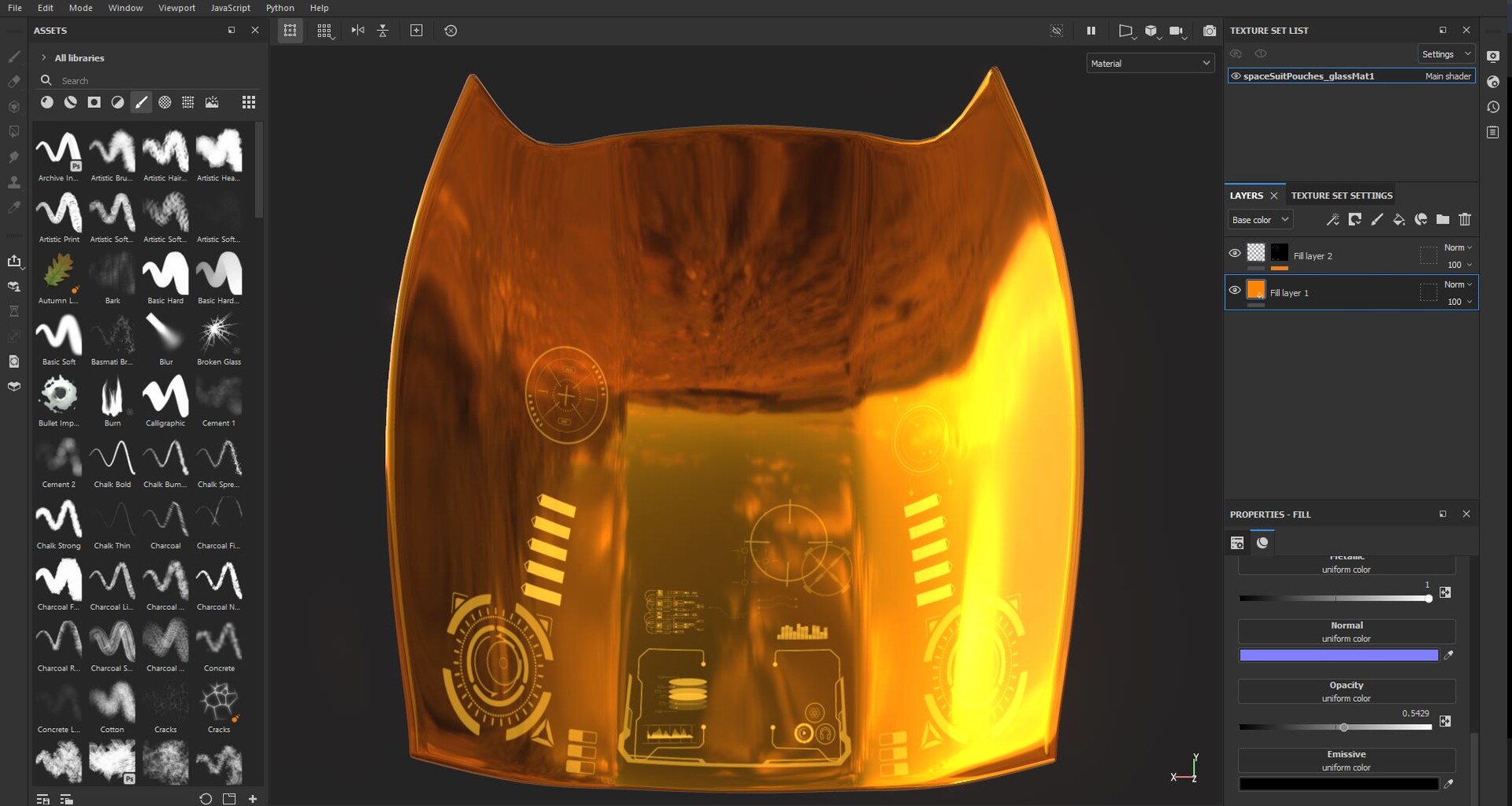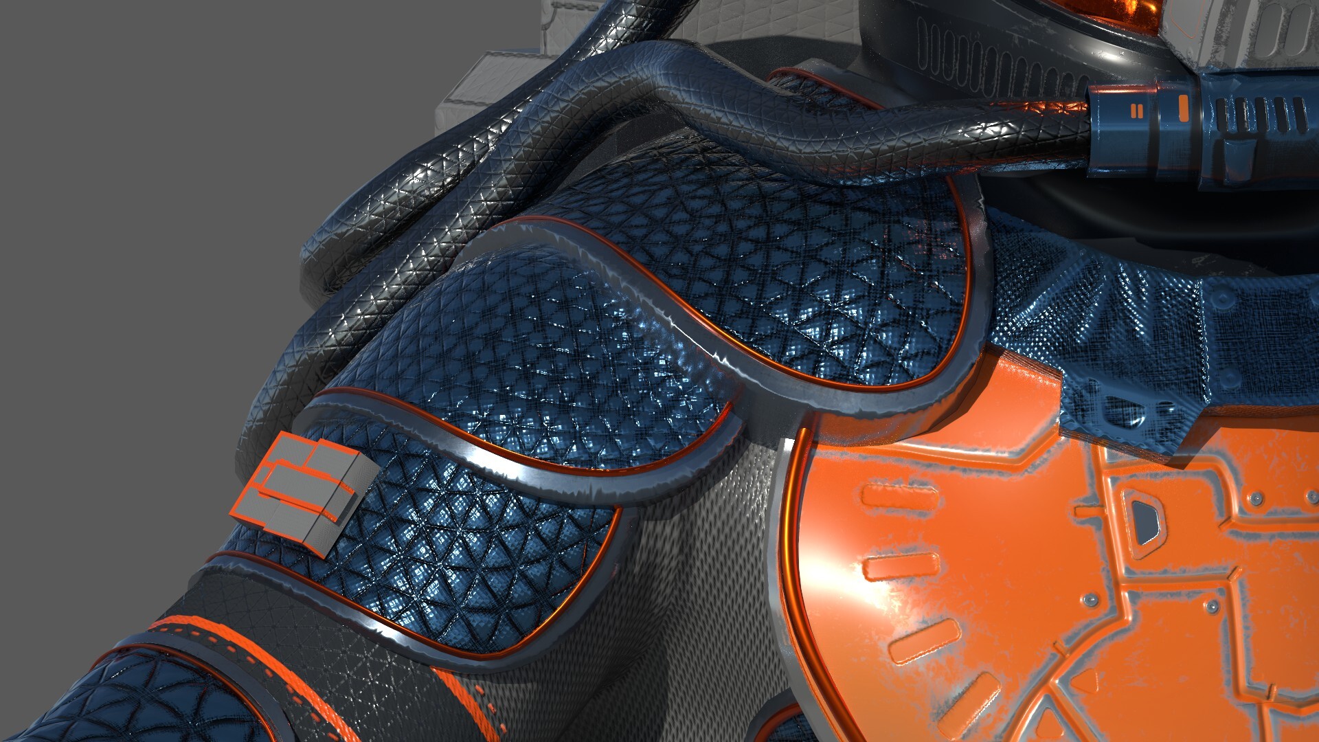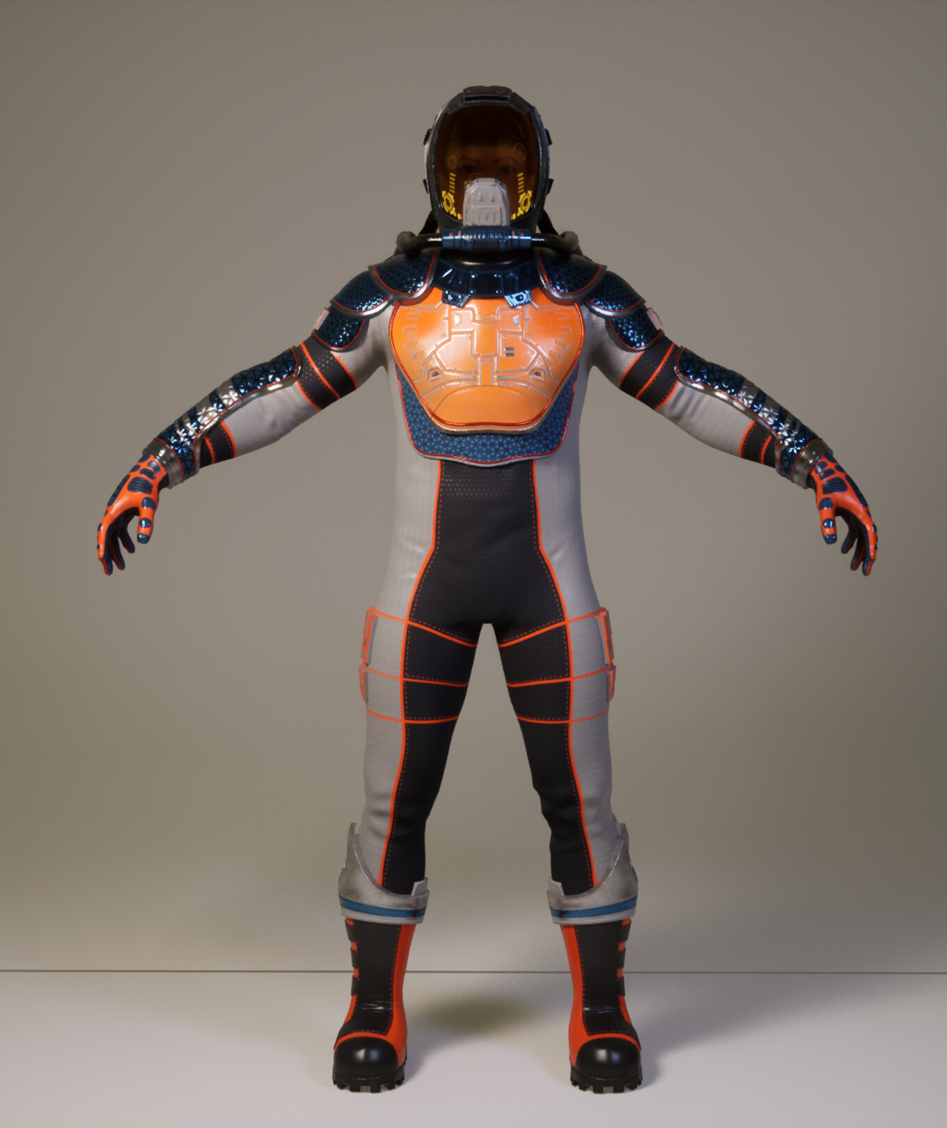The suit was retopologized in Modo, sculpted in ZBrush, and painted in Substance Painter. The final result demonstrates a complete character art pipeline from high-poly sculpt through real-time rendering.