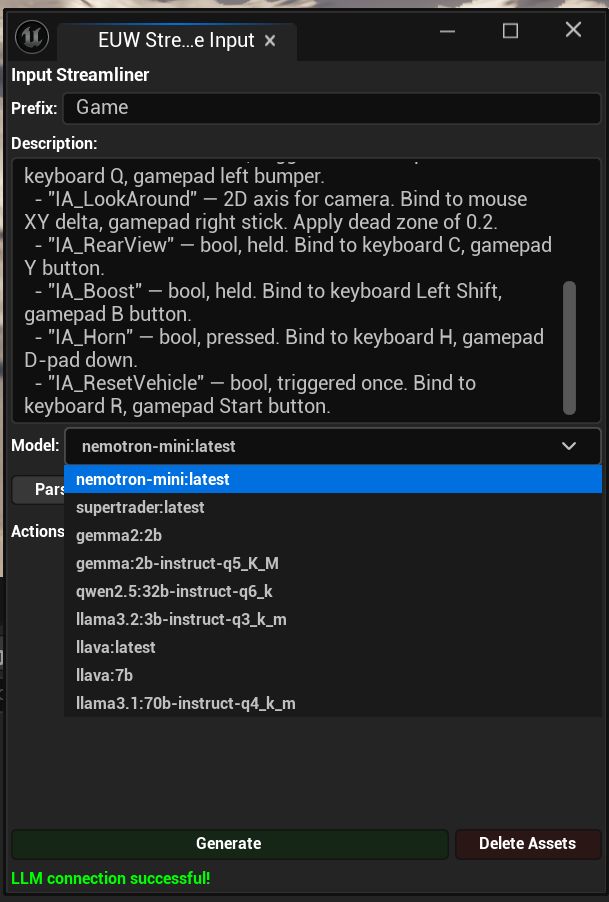 The plugin runs entirely local via Ollama — no API keys or cloud dependency. Pick from any available model, describe the controls you need in plain English, and the plugin generates Input Actions with all bindings and settings automatically configured.