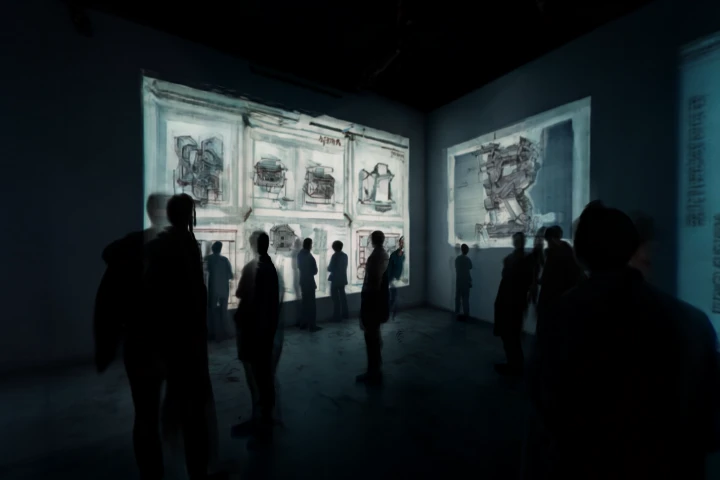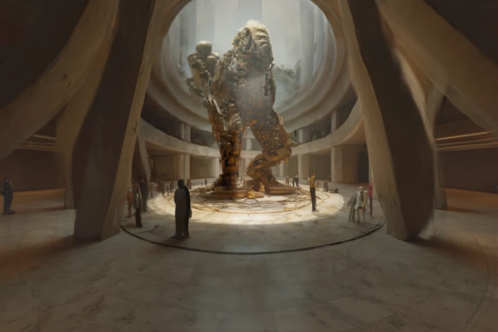 Each of the 11 generated rooms was then converted into a pro-quality 3D Gaussian splat via the World Labs API, auto-cleaned to remove floaters, ghost splats, and blob artifacts. The result is a fully navigable virtual exhibition space.