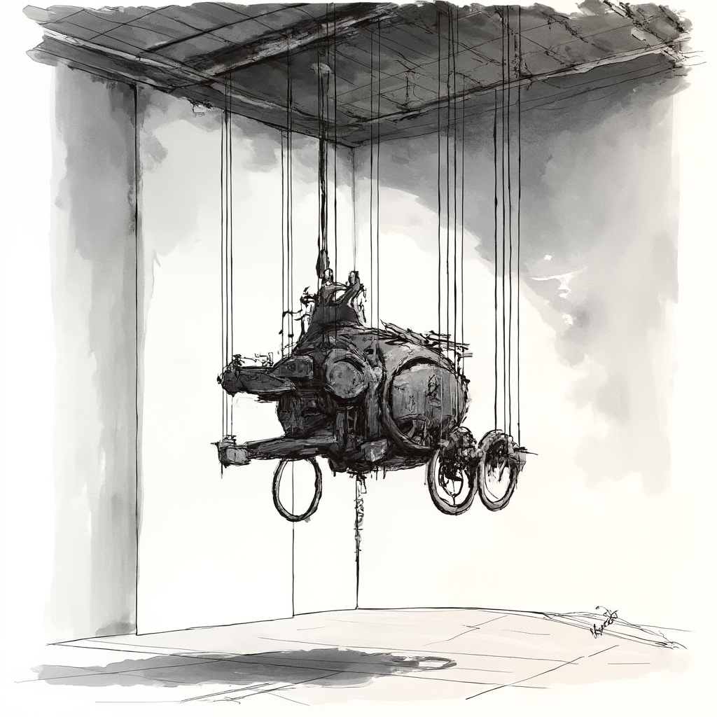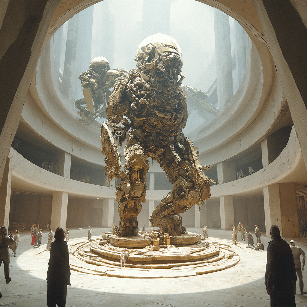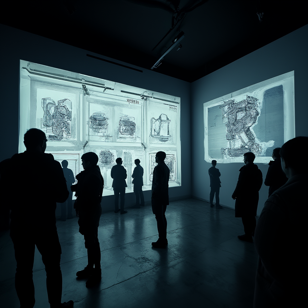 An exhibit concept series generated using a custom marker-mech LoRA trained on 15 hand-drawn mechanical sketches. The model learned the marker rendering style and was prompted to envision spaces for a futuristic art exhibition — from gallery entrances and sculpture halls to immersive projection rooms.