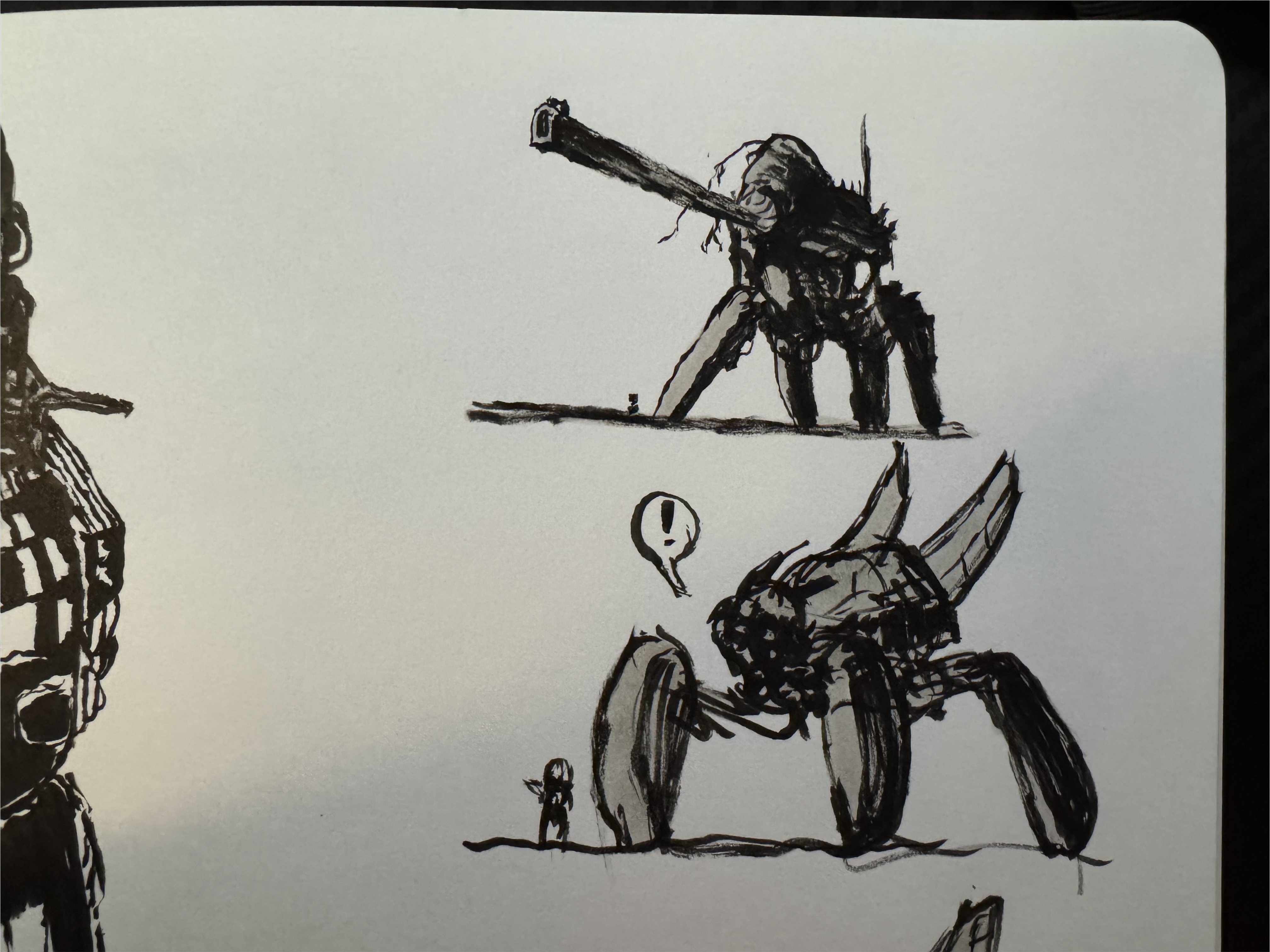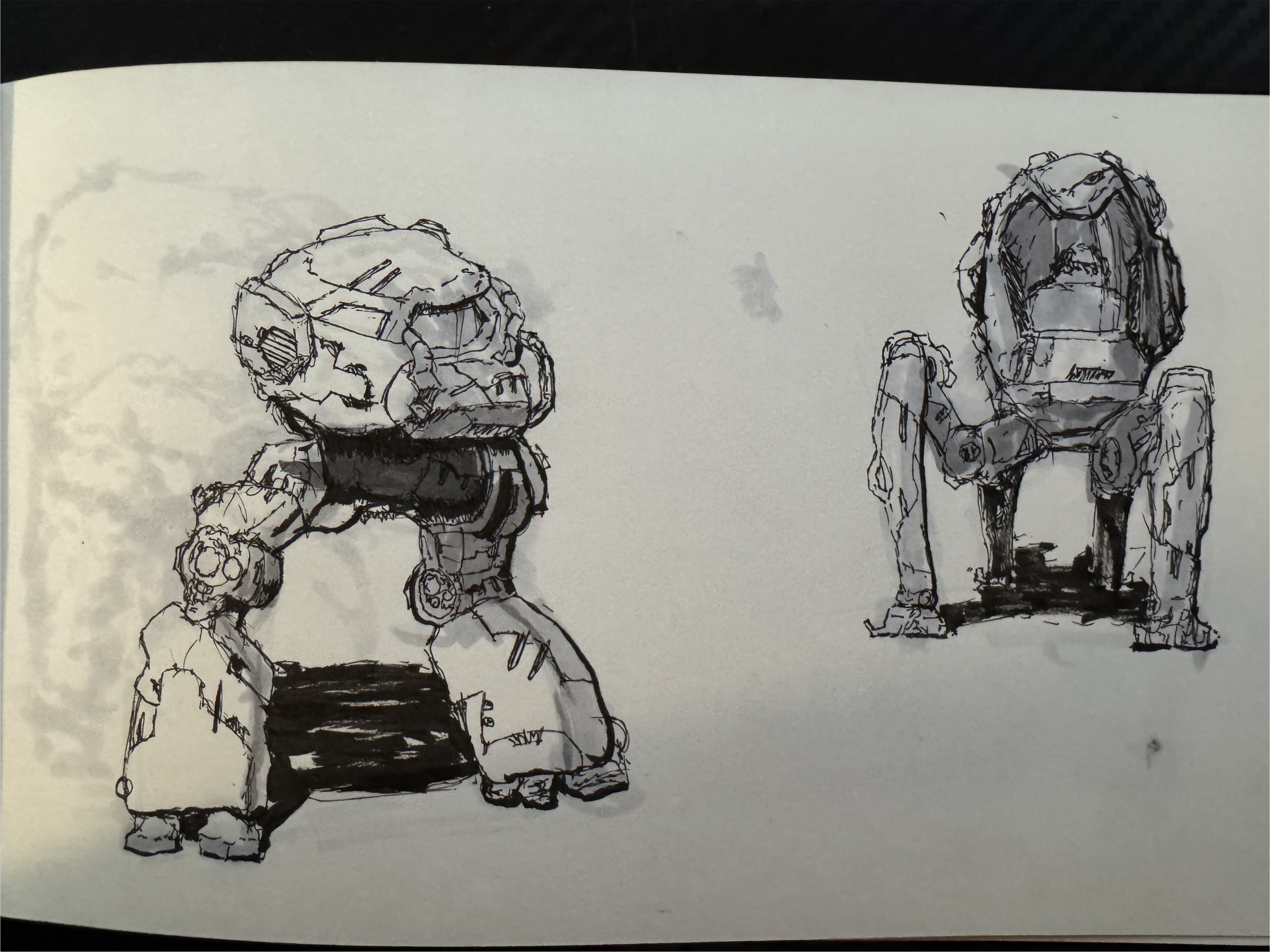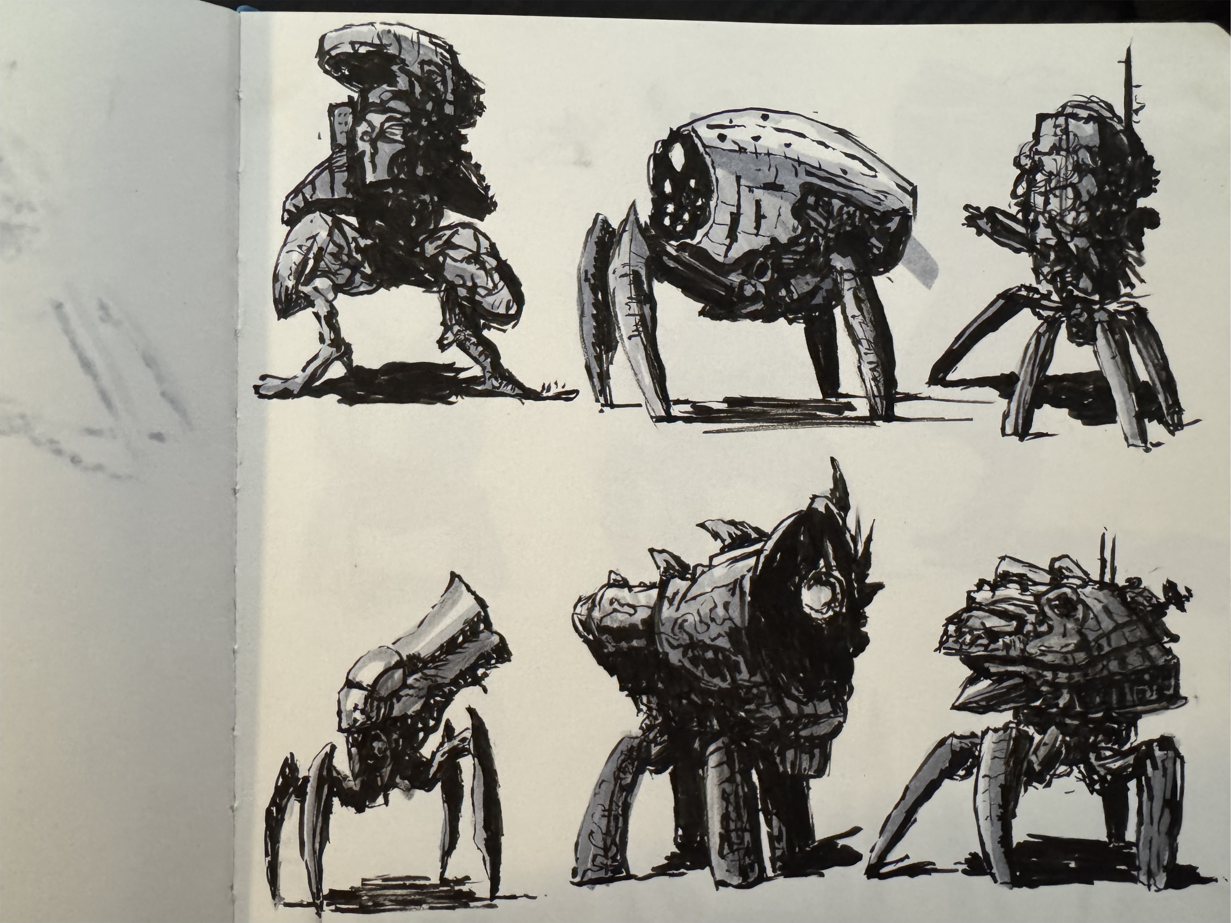 An exhibit concept series generated using a custom marker-mech LoRA trained on 15 hand-drawn mechanical sketches. The model learned the marker rendering style and was prompted to envision spaces for a futuristic art exhibition — from gallery entrances and sculpture halls to immersive projection rooms.