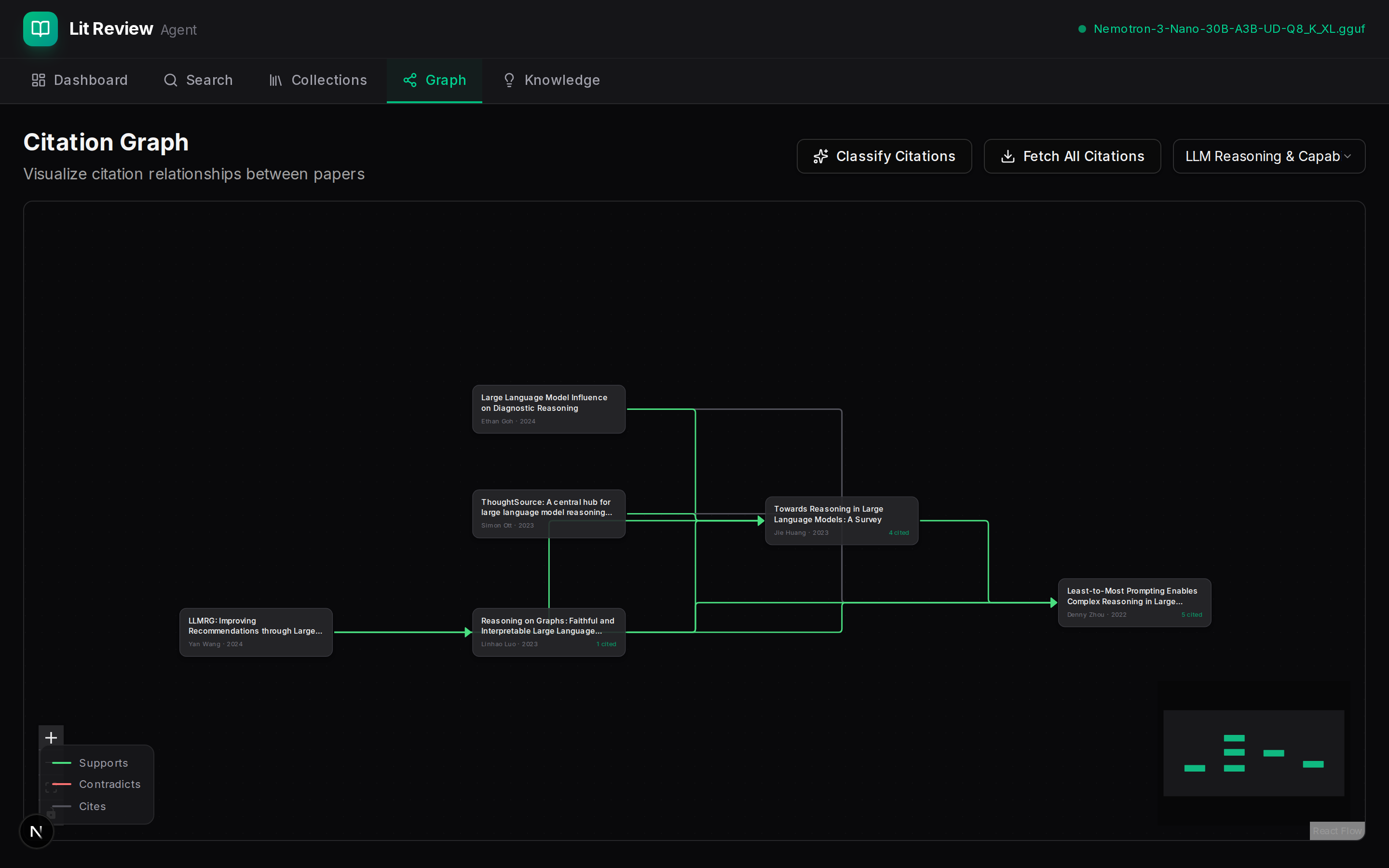 It generates structured paper summaries and cross-paper literature syntheses, visualizes citation networks with relationship classification, and extracts findings, methods, gaps, and conclusions into a searchable knowledge base.