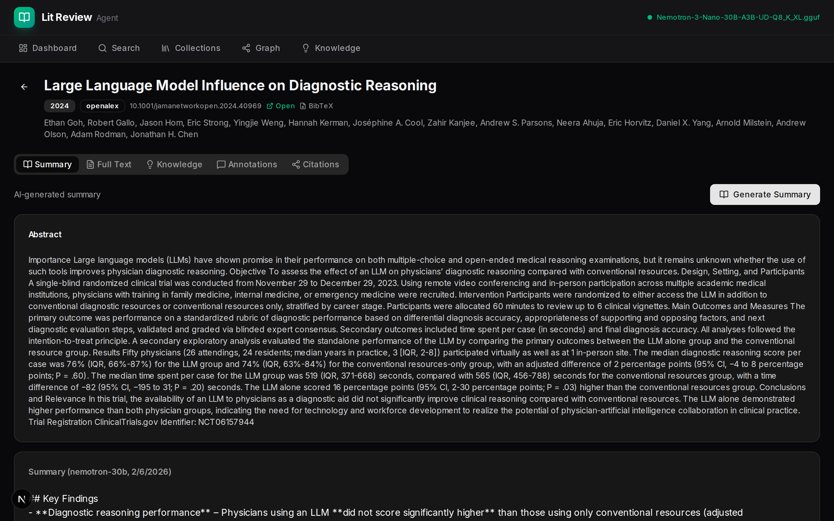 Each paper gets a structured AI-generated summary. Collections of papers get cross-paper synthesis identifying themes, agreements, contradictions, and research gaps.